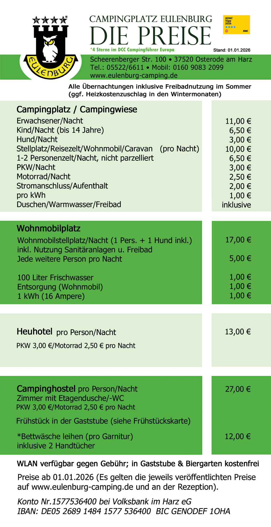 Preise für Camping, Zeltplatz, Wohnmobilstellplätze,